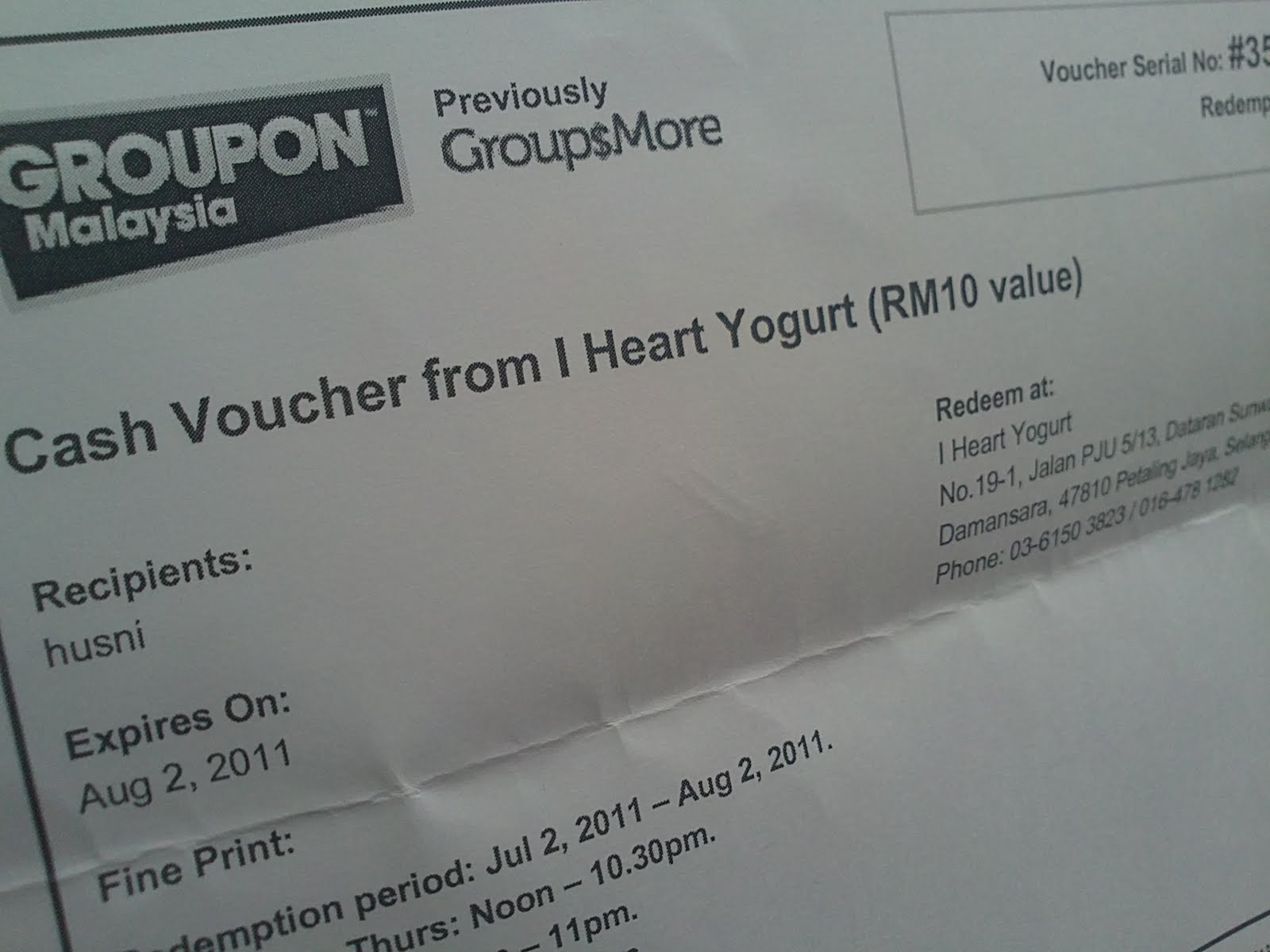 | aku da kemaruk ngan groupon skang ni. smlm balik kerja aku ajak hasben gi sunway damansara sebab aku dah beli RM10 voucher of i heart yogurt dgn harga RM5. aku beli 2 utk hasben skali. ngeeee |